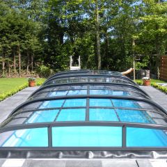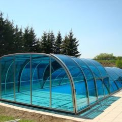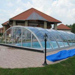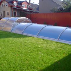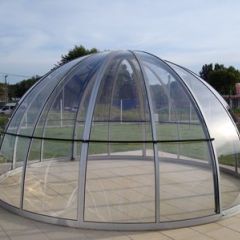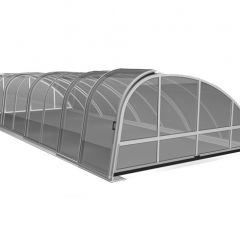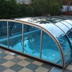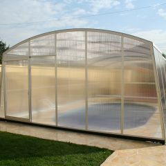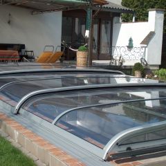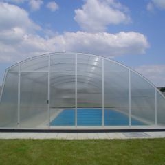 Alacsony, tájba simuló, kosárgörbe keresztmetszetű, 10 mm-es polikarbonát üvegezéssel készített medencefedés típus.