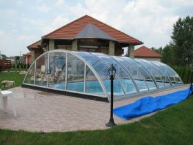 Körív keresztmetszetű, 10 mm-es üregkamrás polikarbonát üvegezéssel készített medencefedés.
